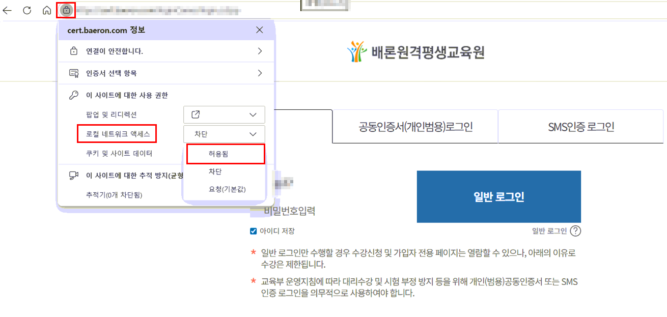 ¾Ë¸²Ã¢ÀÌ ¾È ¶ß°Å³ª ÀÌ¹Ì ¡¸Â÷´Ü¡¹À» ´©¸¥ °æ¿ì → [Chrome/Edge ¼³Á¤ → °³ÀÎÁ¤º¸ º¸È£ ¹× º¸¾È → »çÀÌÆ® ¼³Á¤ → ÇöÀç »çÀÌÆ® ¼±Åà → ¡¸·ÎÄà ³×Æ®¿öÅ© ¾×¼¼½º¡¹ Çã¿ë]