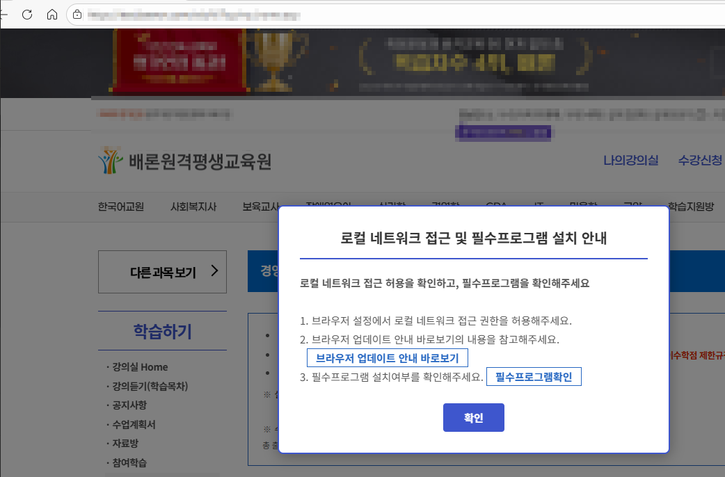 STEP 02 ½Ç¼ö·Î Â÷´ÜÀ» ¼±ÅÃÇÑ °æ¿ì, [·Î±×ÀÎ ÆäÀÌÁö] ¹× [°ÀǽÇ] Á¢¼Ó ½Ã ¾È³» ÆË¾÷ÀÌ ³ªÅ¸³¯ ¼ö ÀÖ½À´Ï´Ù. ÆË¾÷³»¿ëÀ» È®ÀÎÇÏ¿© ºê¶ó¿ìÀú ÁÖ¼Òâ ÁÂÃø ¾ÆÀÌÄÜÀ» Ŭ¸¯ ÈÄ '·ÎÄà ³×Æ®¿öÅ© ¾×¼¼½º' ¿É¼ÇÀ» ON(Çã¿ë)À¸·Î º¯°æÇØÁÖ¼¼¿ä.